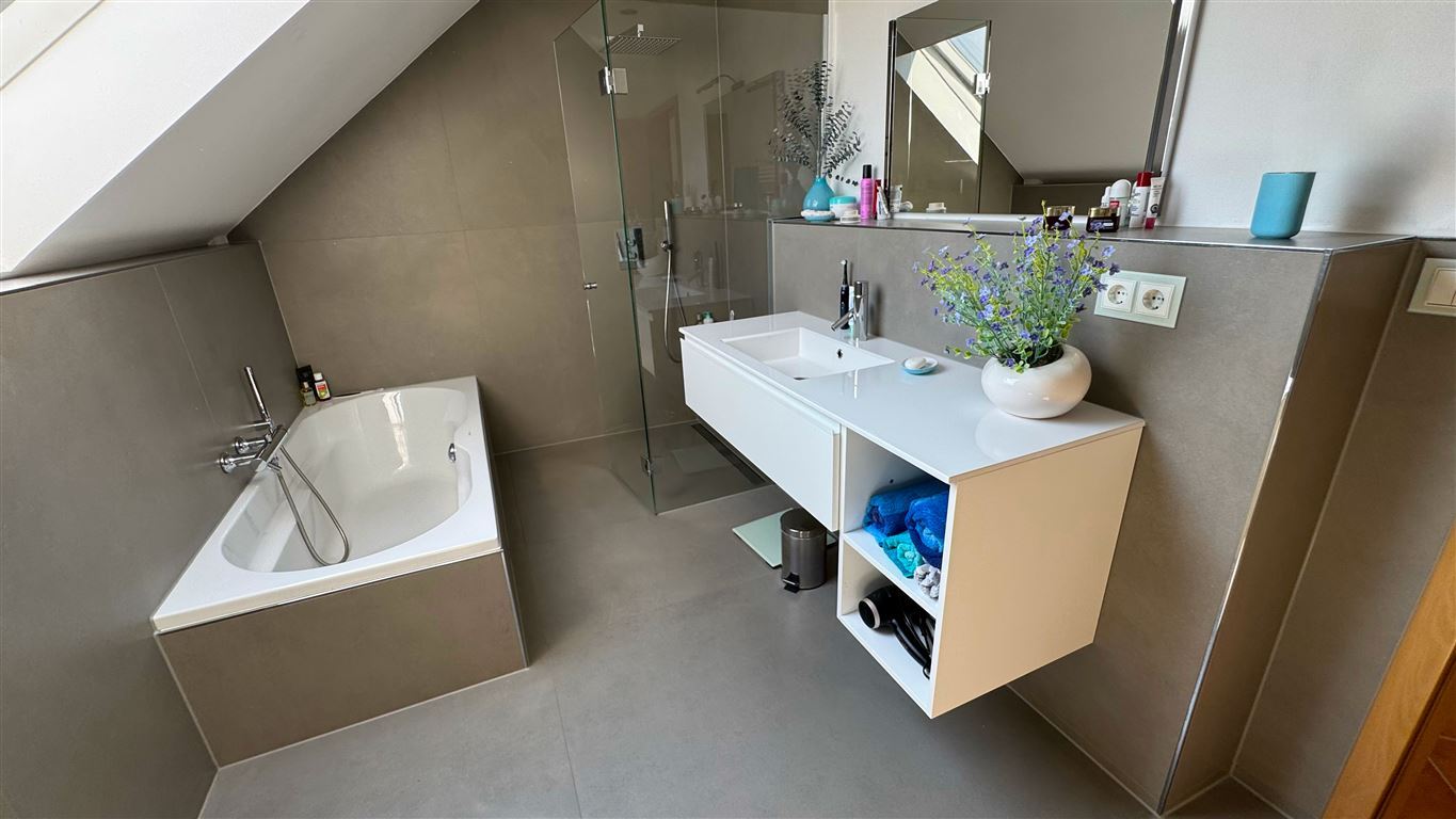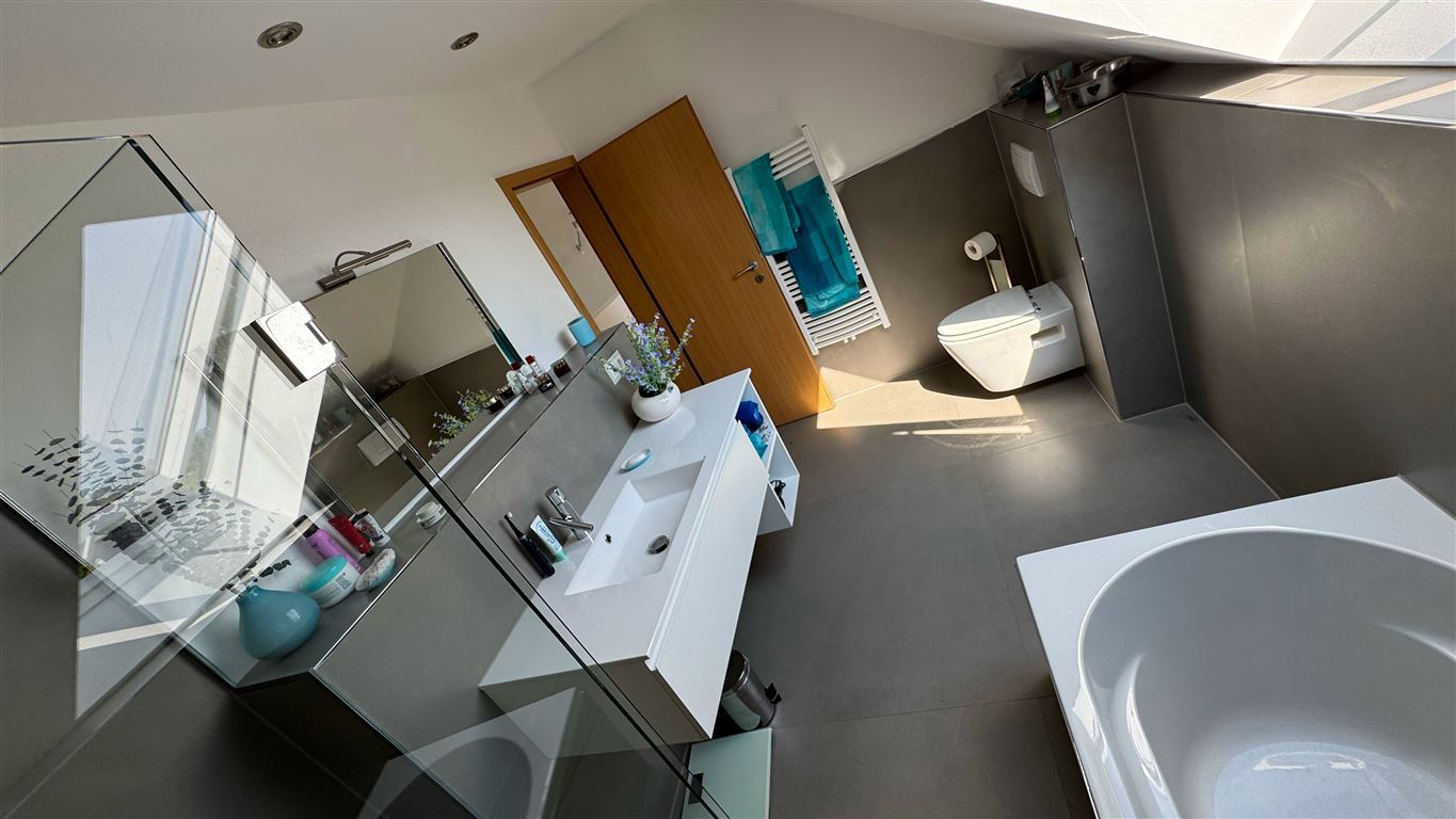 Das luxeriöse Bad wurde bereits renoviert. Die großformatigen Fliesen schaffen eine hochwertige Eleganz. Badewanne und Dusche, Waschtisch sowie Armaturen sind erlesen ausgewählt.