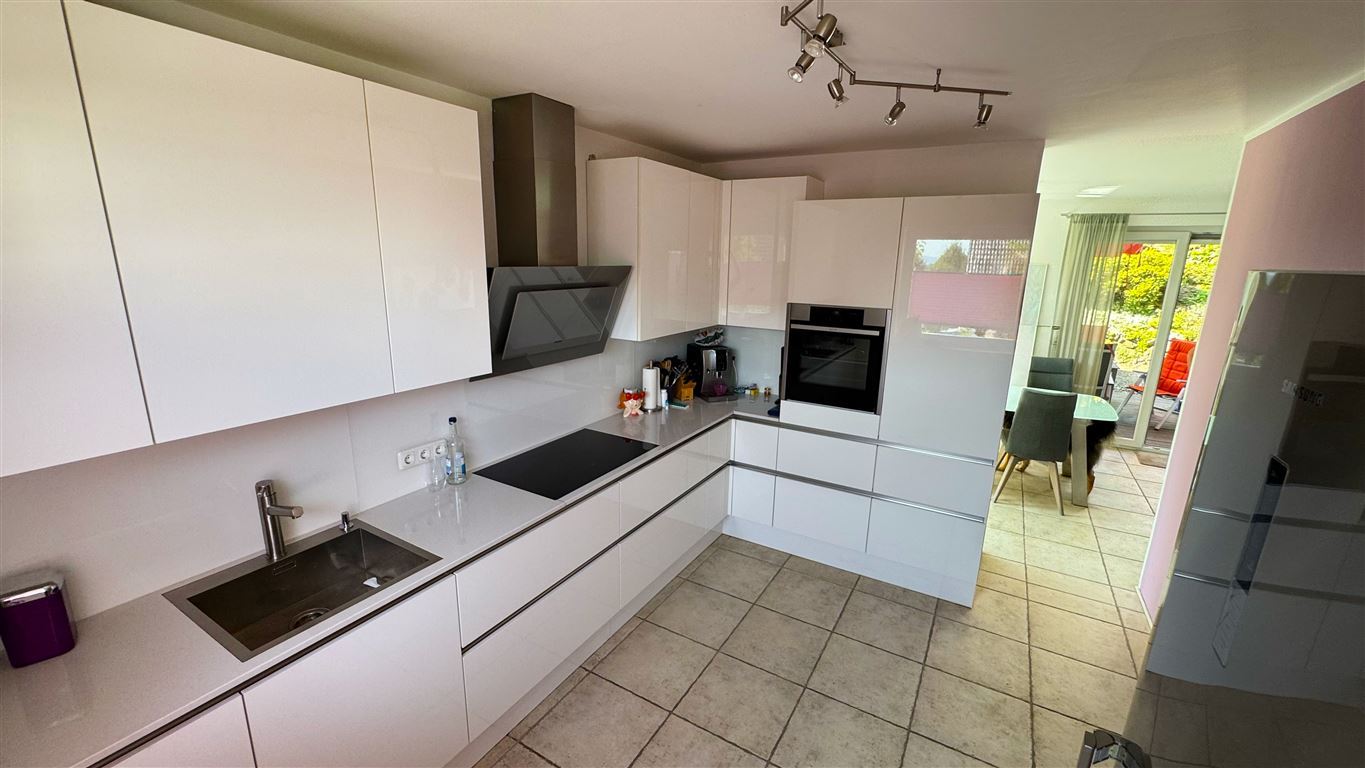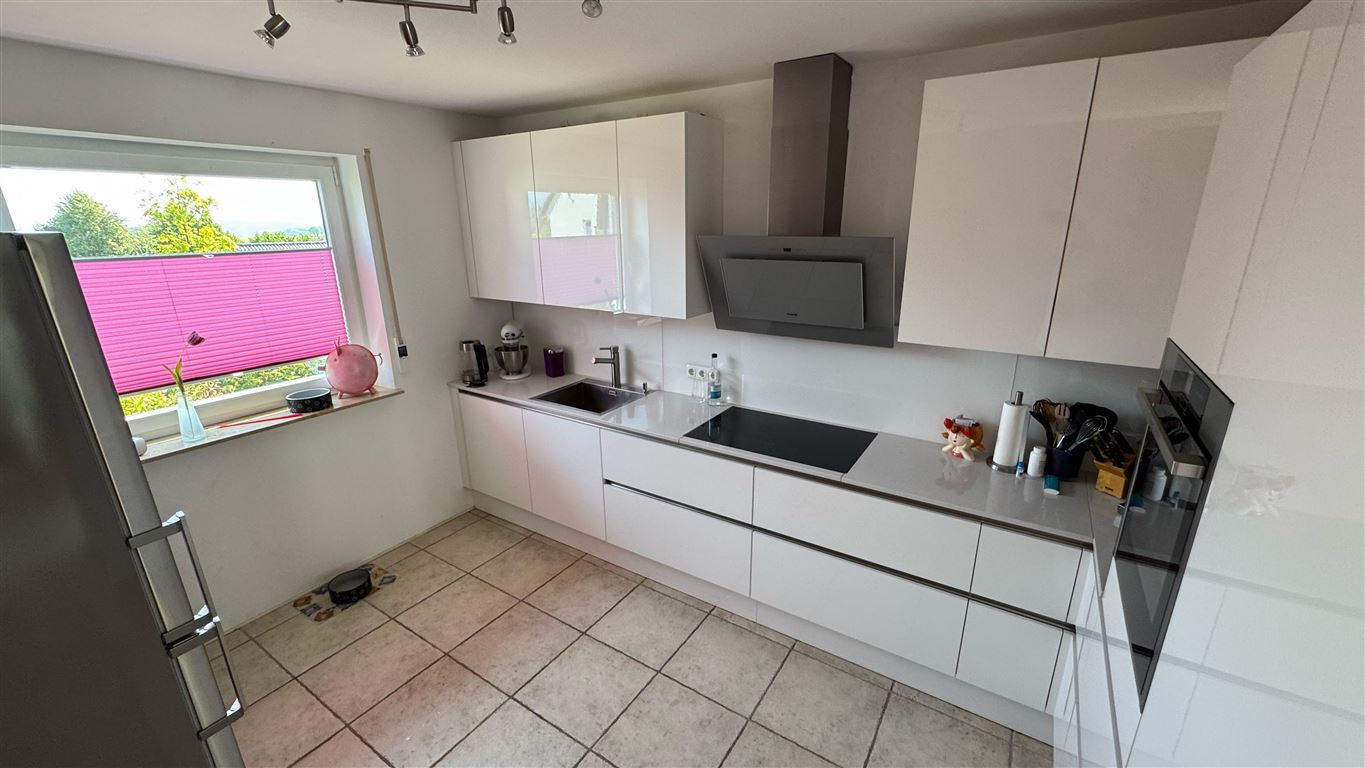 Das Erdgeschoss ist weitgehend offen gestaltet: Es erwartet Sie ein großzügiger Wohn-/Essbereich mit Zugang auf die Terrasse. Die Küche: Modern in Hochganz weiss mit allen Elektrogeräten. Sie kann nach Absprache auch übernommen werden. Angeschlossen ist hier noch ein Vorratsraum. Desweiteren haben wir ein Gäste-WC mit Dusche und den HWR.
