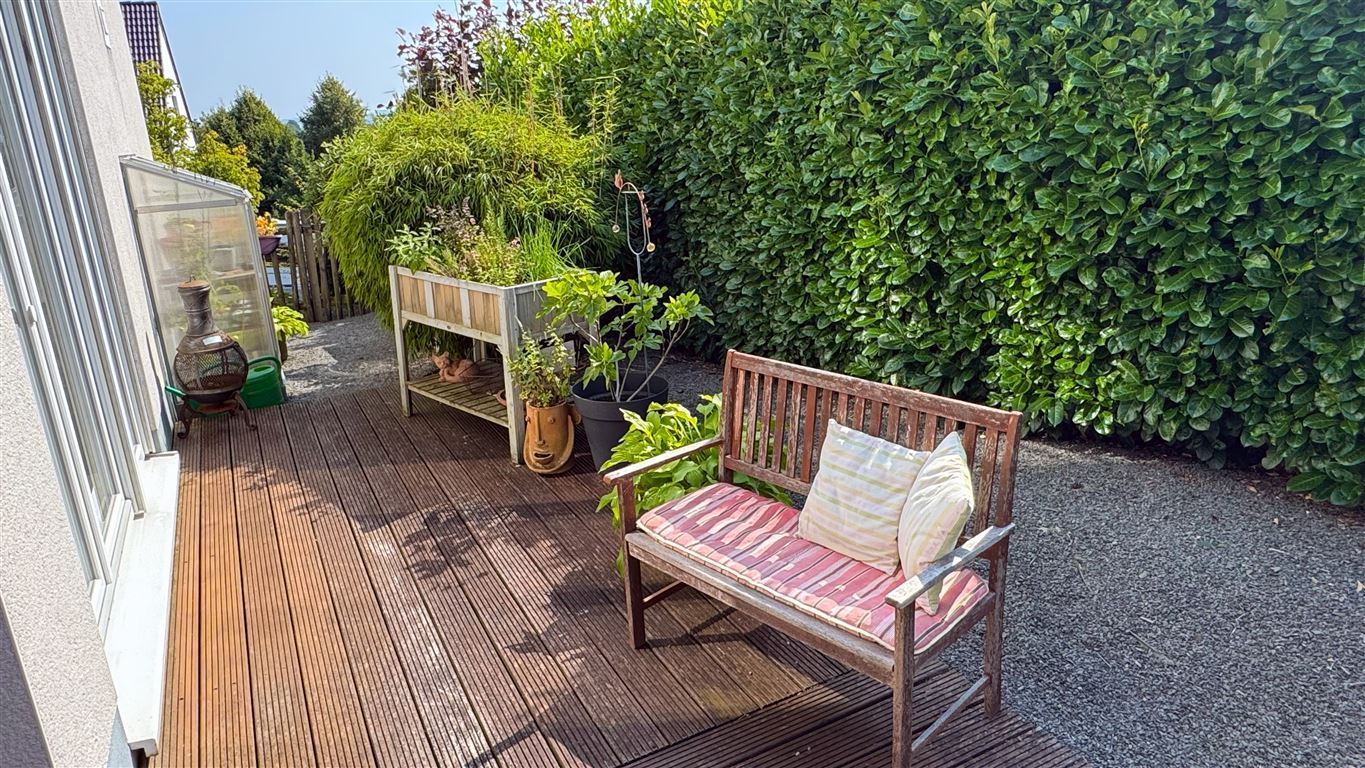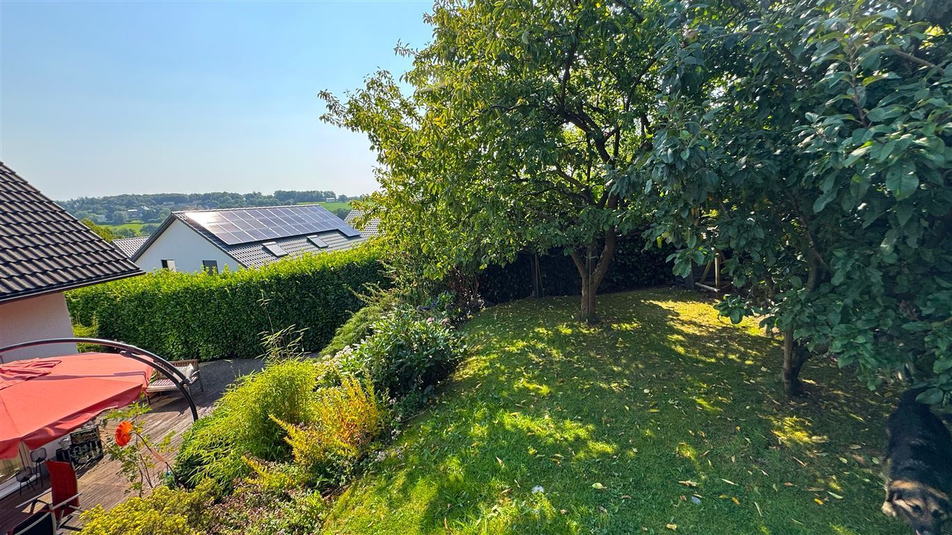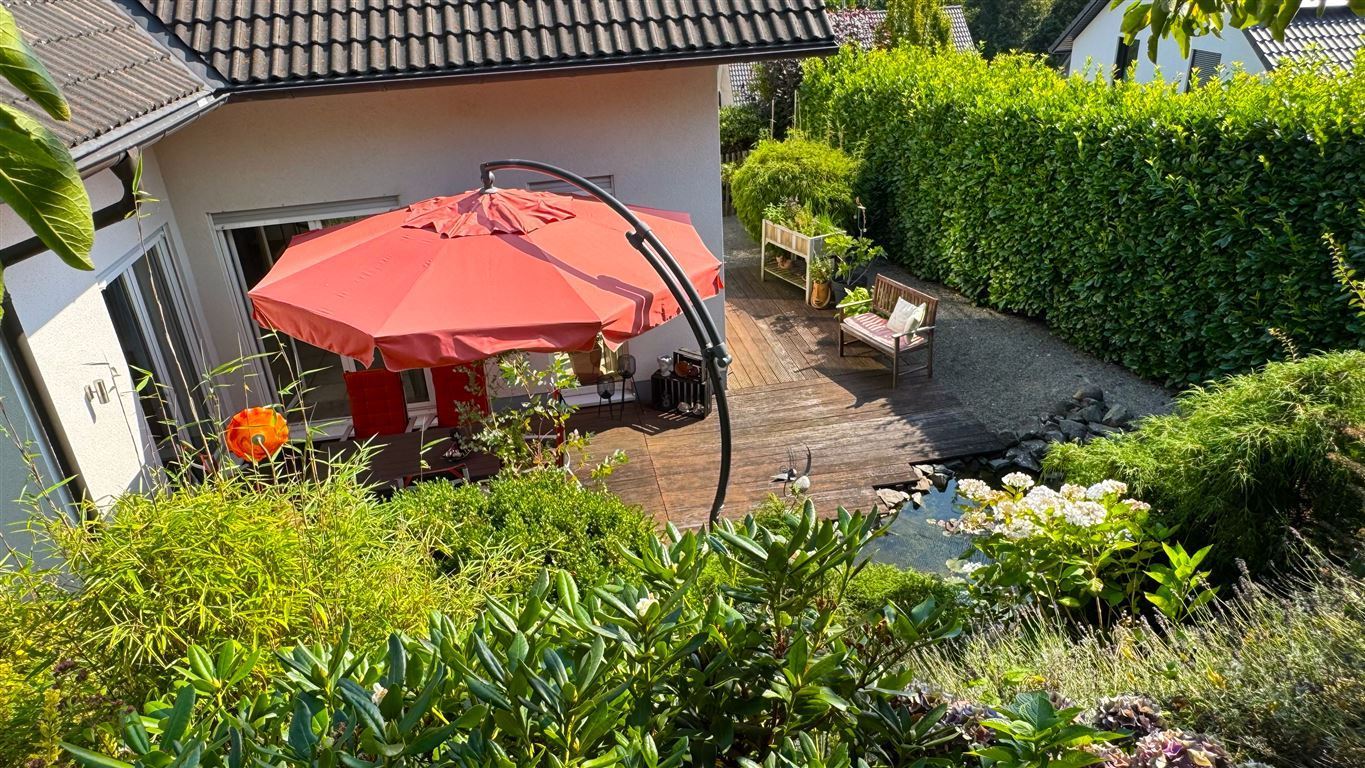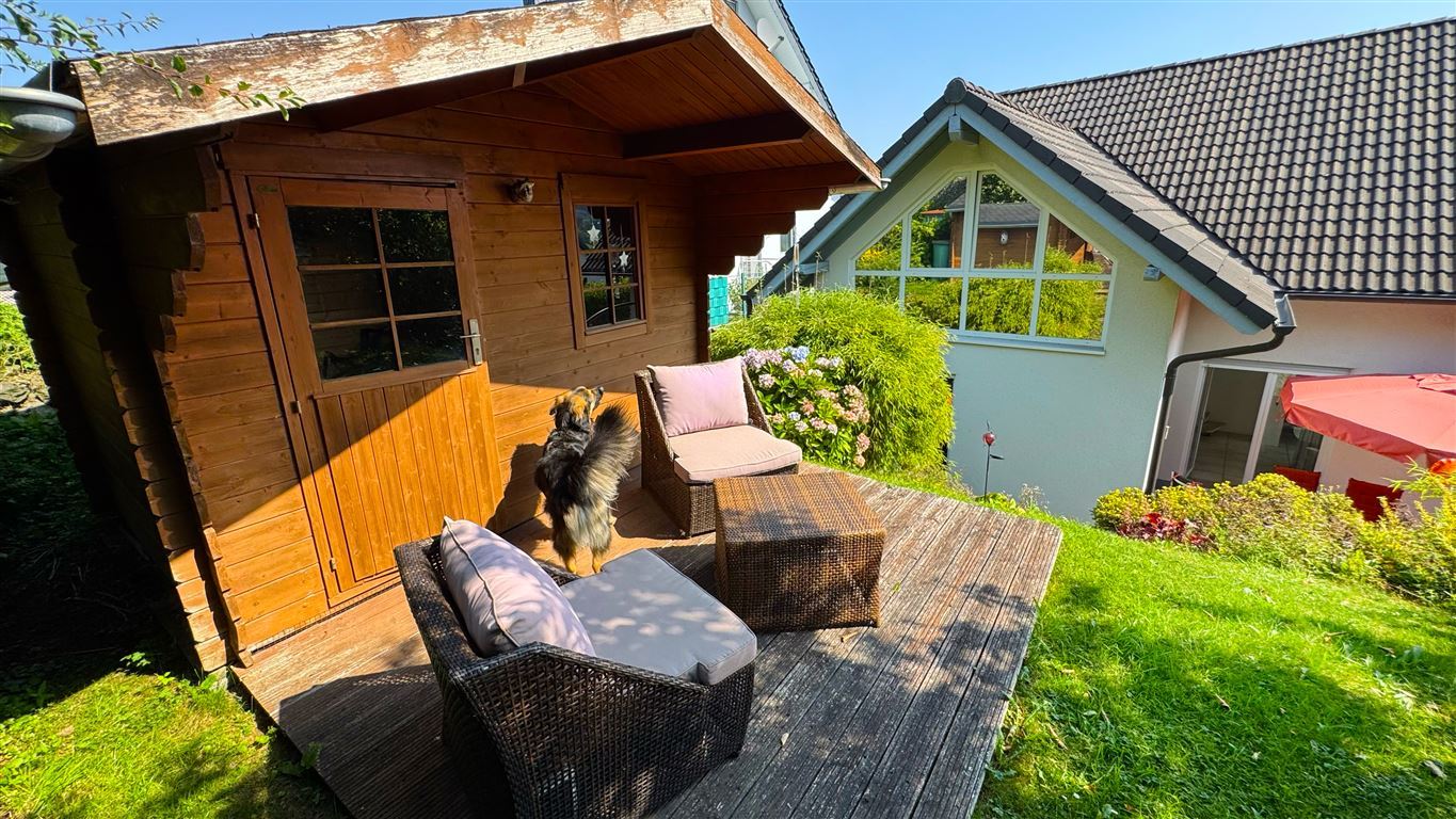 Zum Garten: Die Terrasse ist wunderschön angelegt mit Blick auf den üppig bepflanzten Hang und Teich. Ein Gartenhaus für Gerätschaften oder weitere Spiel- und Entspannungsebene runden die Ausstattung ab.