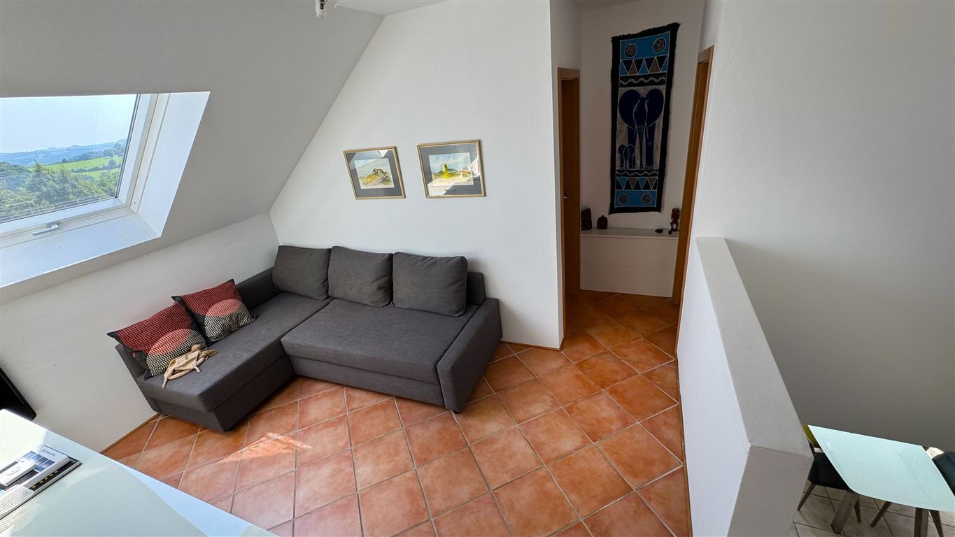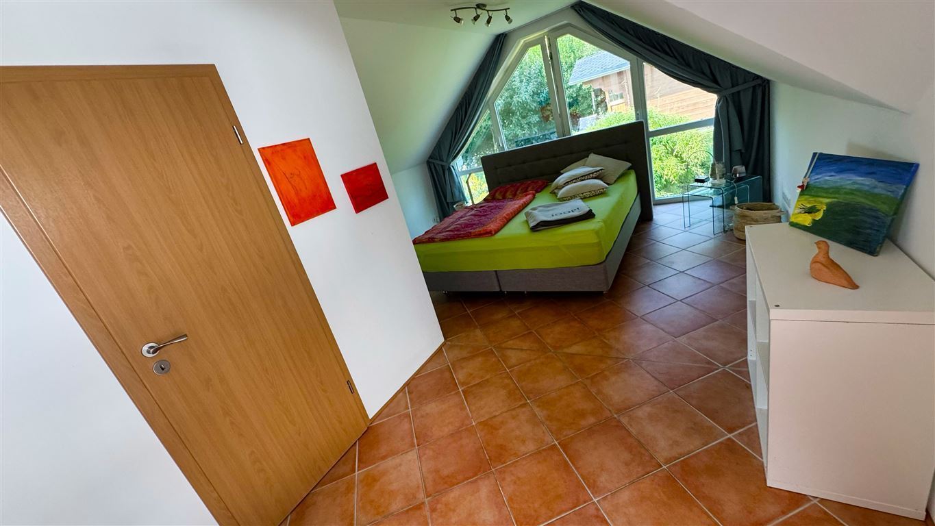 Der Boden des OG ist bis auf das Bad einheitlich terracottafarben gefliest.