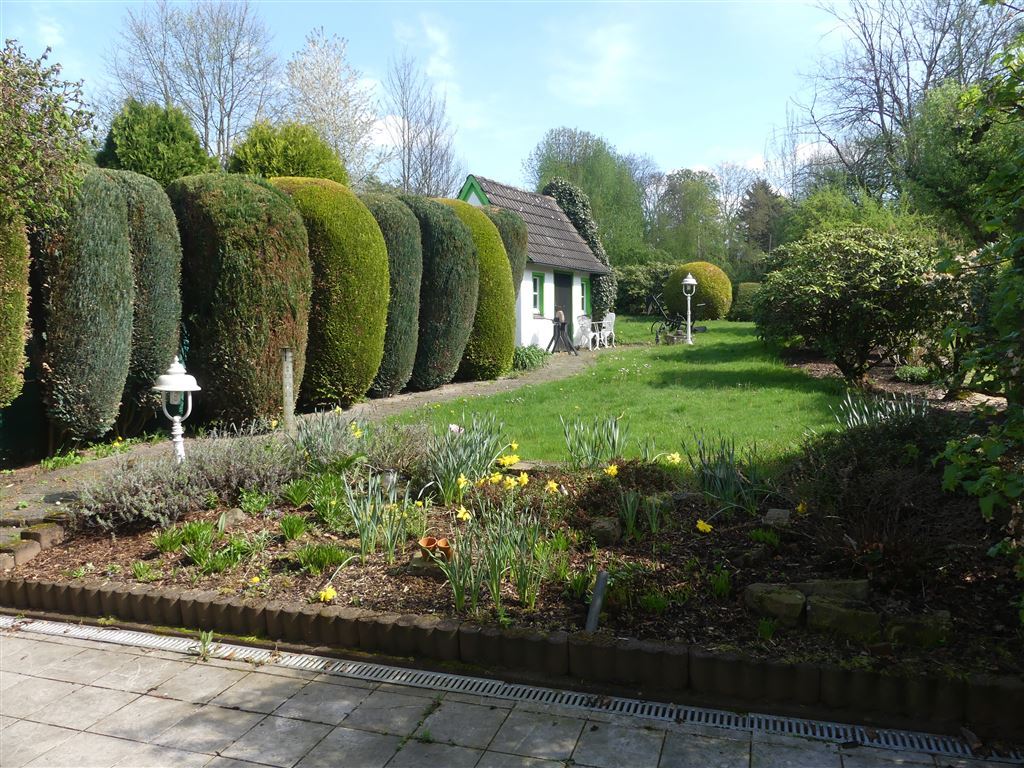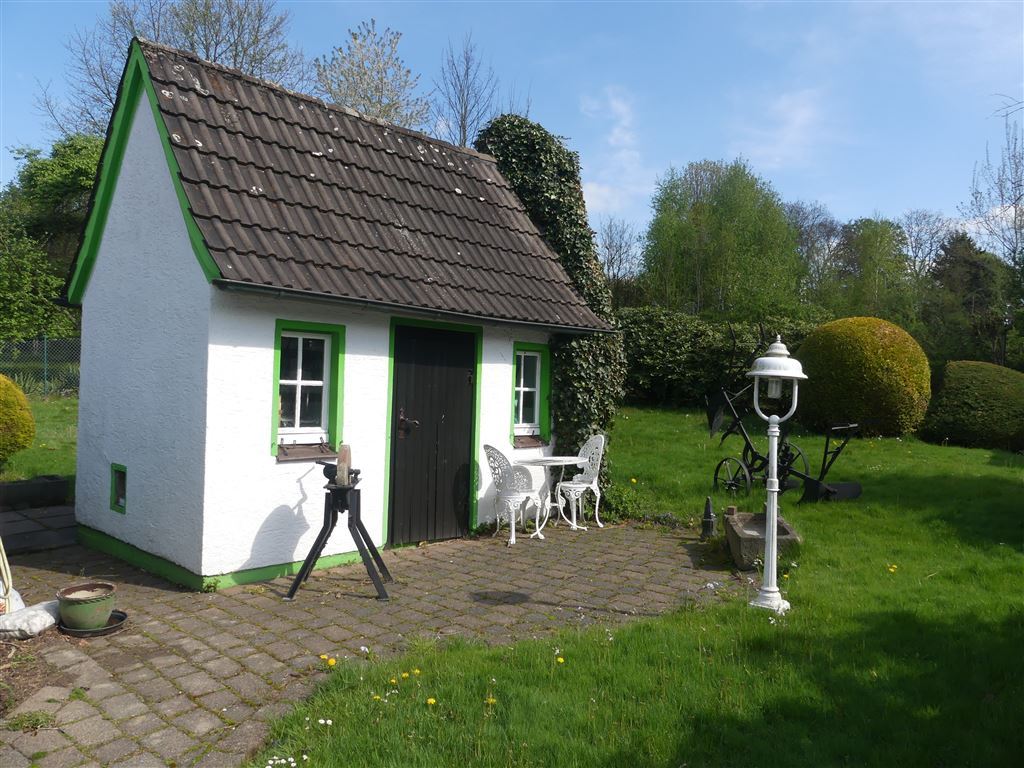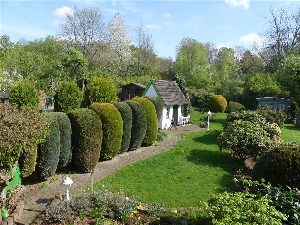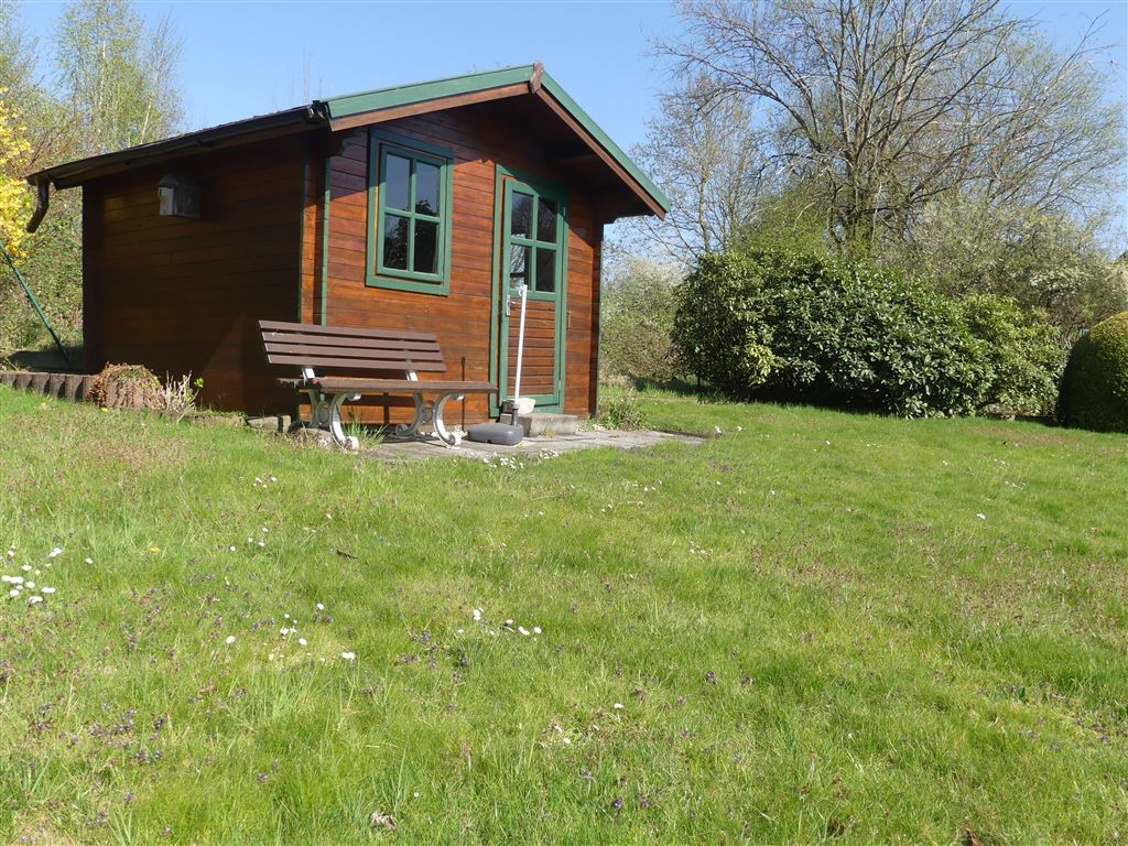 Der sonnige Garten direkt angrenzend an die Terrasse ist sehr schön angelegt und verfügt im hinteren Bereich über weitere großzügige Rasenfläche mit Gartenhaus und weiterem Blockhaus für gemütliche Stunden und Gerätschaften. Auch der Blick vom Balkon des OG zeigt: Eine echte Ruheoase!
