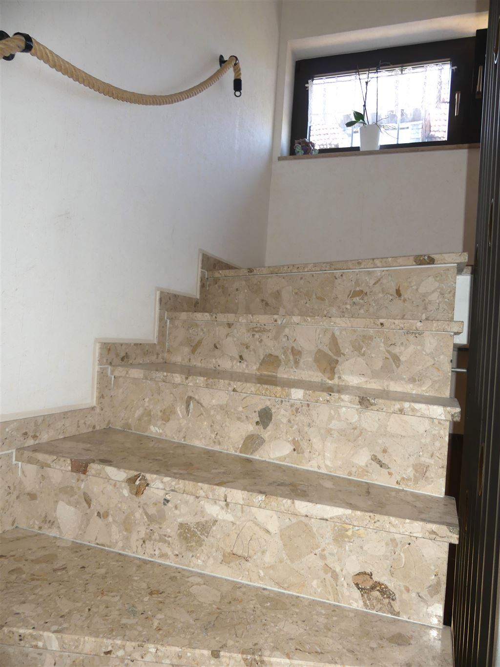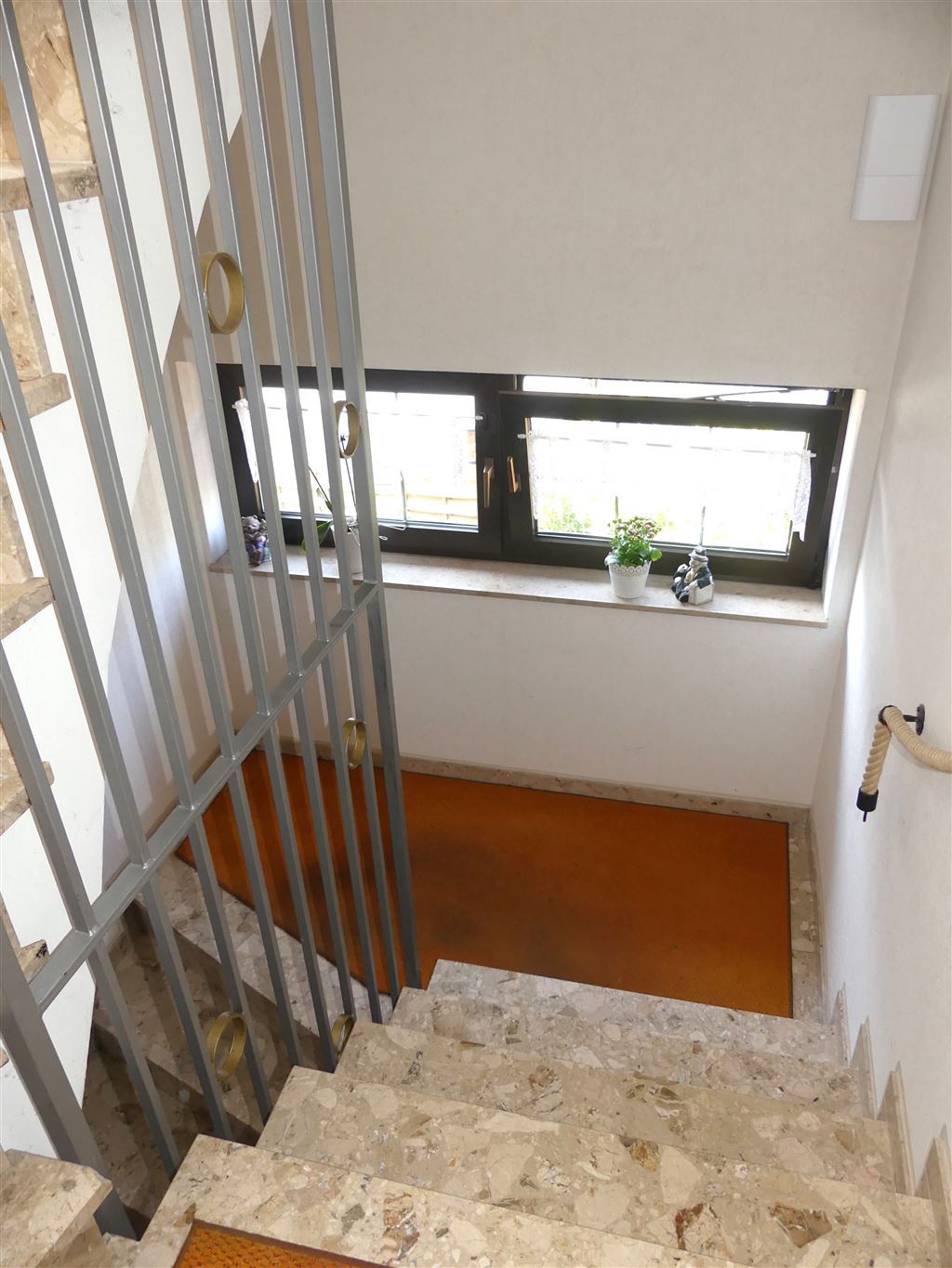 Sie treten ein und befinden sich im hell marmoriert gestaltetem Treppenhaus. Von hier aus erreichen Sie: